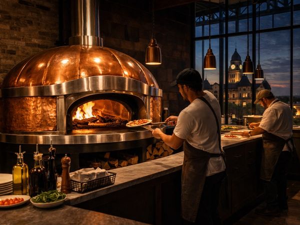 Experience a 1920s Wood-Fired Pizza, Italian American Ambiance with Stunning Skyline Views.